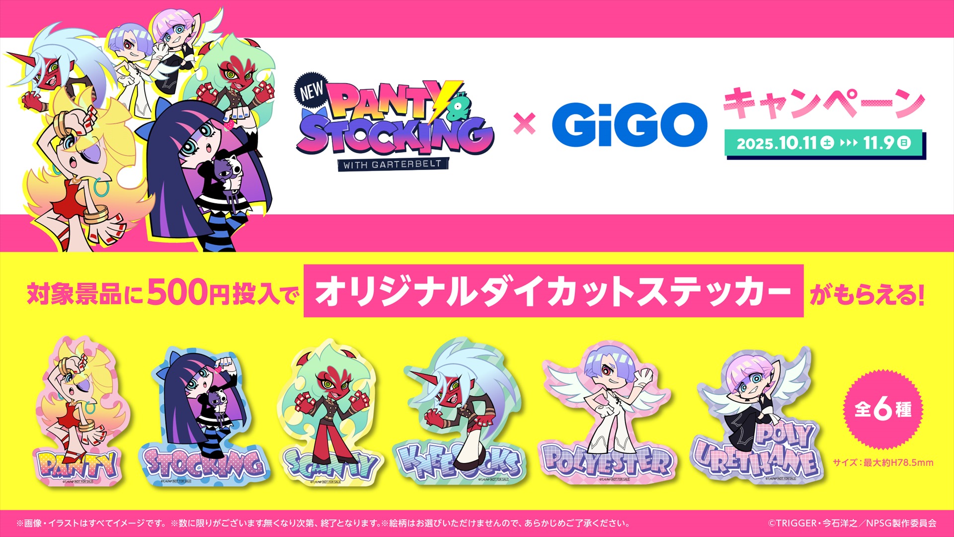 対象のクレーンゲームへ500円ご利用毎に『オリジナルダイカットステッカー(全6種)』をランダムで1枚差し上げます。